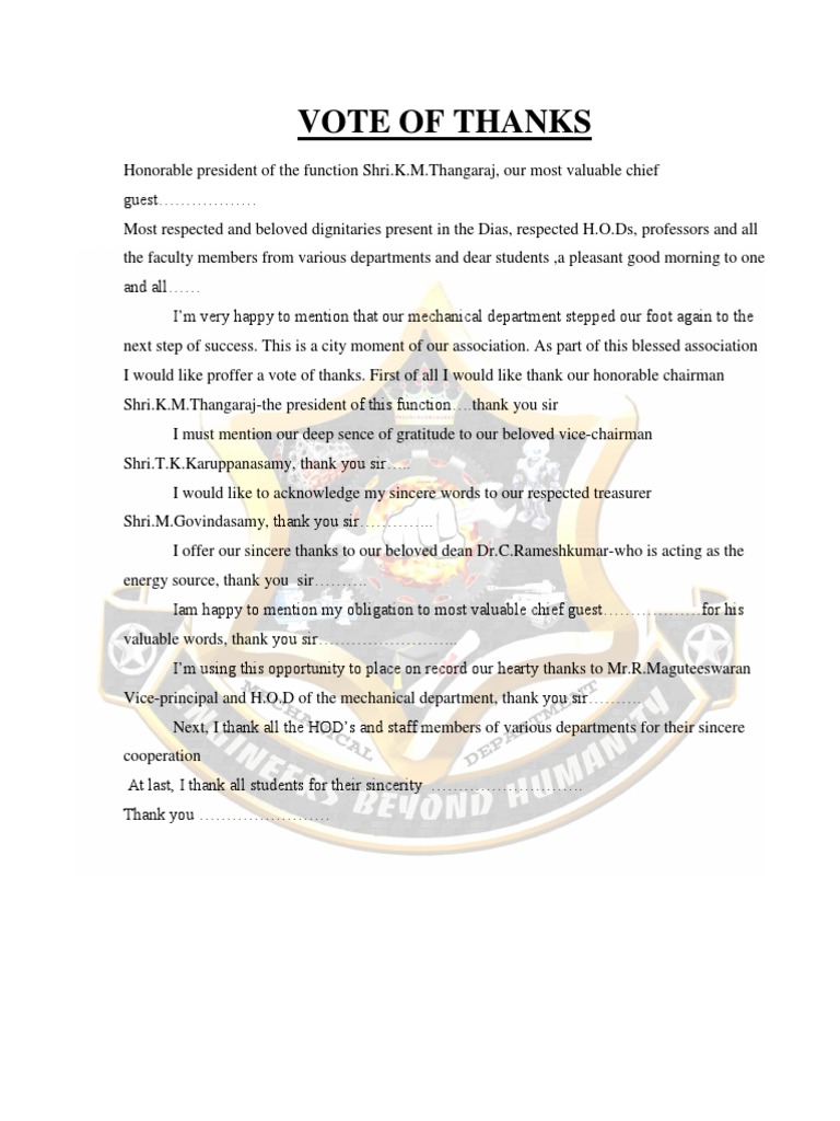 Vote of thanks speech for a farewell. Contents 1 What is a Vote of Thanks Speech. Vote of thanks in tamil generally for tamil speech competition Page Link.